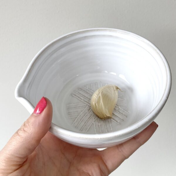 Handrejad skål med rivyta i botten. Du kan enkelt riva vitlök eller ingefära i botten. Häll sedan resten av dina ingredienser som olja och kryddor för att göra en god marinad, kall sås (som kan serveras i skålen) eller dressing till salladen. Mått; mellan 10-12cm i diameter.